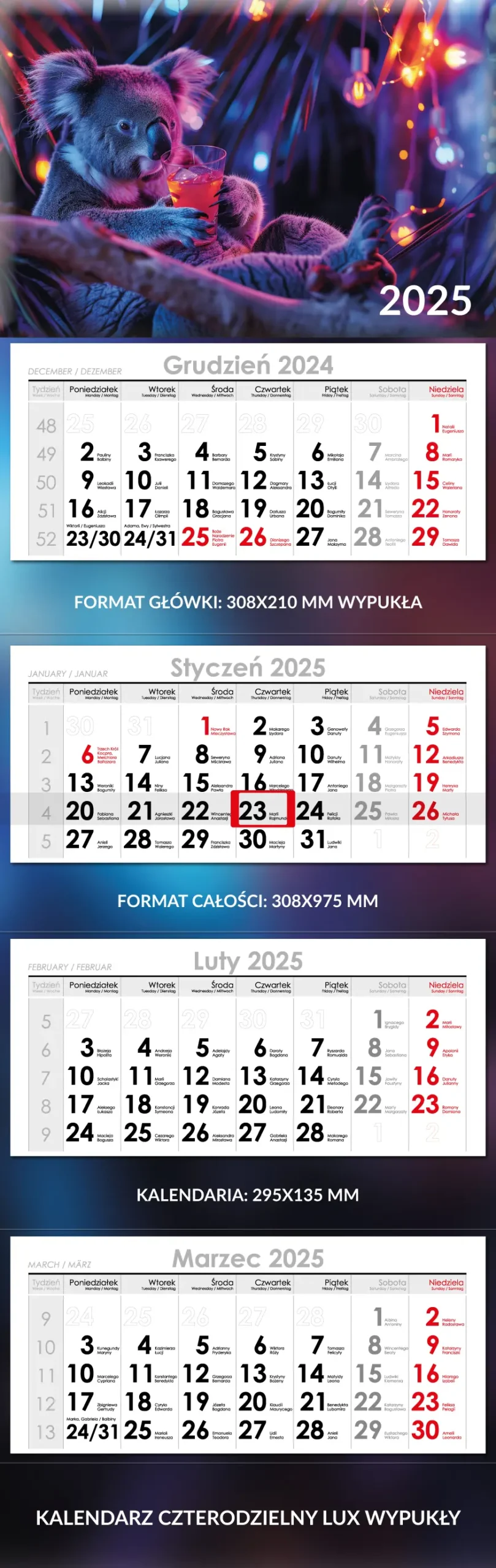 Inne: | miejsce na reklamę pomiędzy kalendariami, czerwone okienko |